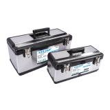 Profesionální box na nářadí v kombinaci plastu a nerezu. Pevný a odolný pro vysokou zátěž, je možné jej použít i jako stupínek (max. 100 kg). Kovové přezky a oko na uzamčení visacím zámkem. Žlábek pro zakládání trubek a latí při řezání. Obsahuje box XT90000 a XT90001.